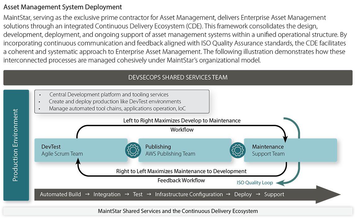 Your firm supplies advanced cloud-based software. Your company develops, publishes, and supports your solutions as the primary sole contractor. Your advantage over alternative teaming or competitive solutions requiring a third party for support may not at first appear obvious to the reader. Your RFP writer crafts language to describe the value of all teams working under the same corporate umbrella, using the same tools, and having the same access to field data issues and feedback. The writer wants to express the advantages of an International Standards Organization (ISO) compliance quality assurance model through customer field data immediately available to development (which is very difficult for teaming proposals to match). To keep the writing concise, an infographic provides most of the information.